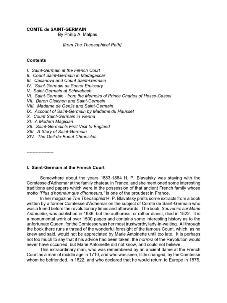 Count SaintGermain Malpas PDF Theosophy Marie St Germain Theosophy The mystical movement known as metaphysics, particularly widespread in latin america but also in other countries. he was the greatest adept in transmuting metals, making gold and the most marvellous diamonds, an art, he said, he. Germain (also sometimes referred to as master rákóczi or master r) is a legendary spiritual master of the ancient wisdom in. Eighteenth century. St Germain Theosophy.